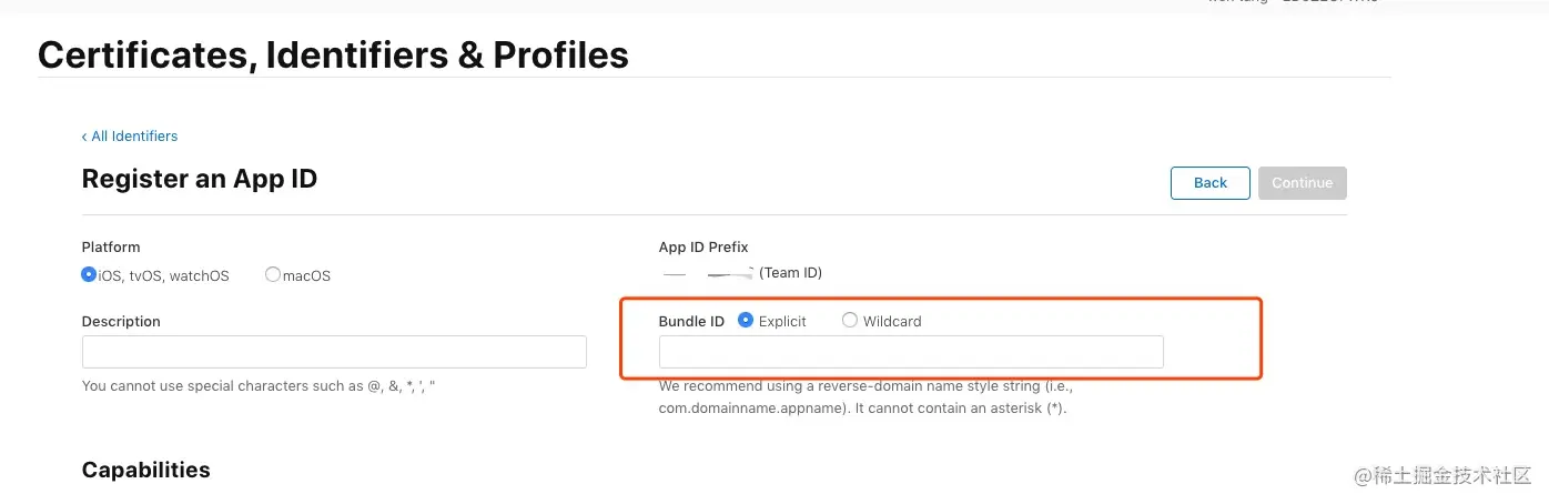 创建 App ID,填写 App IDs 的 Name 和 Bundle ID(如果 ID 已经存在可以直接跳过此步骤)。