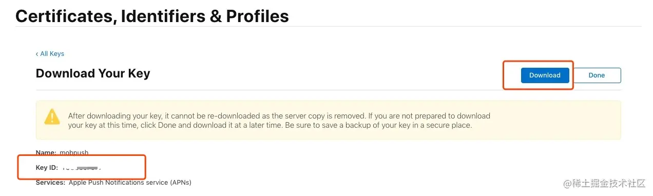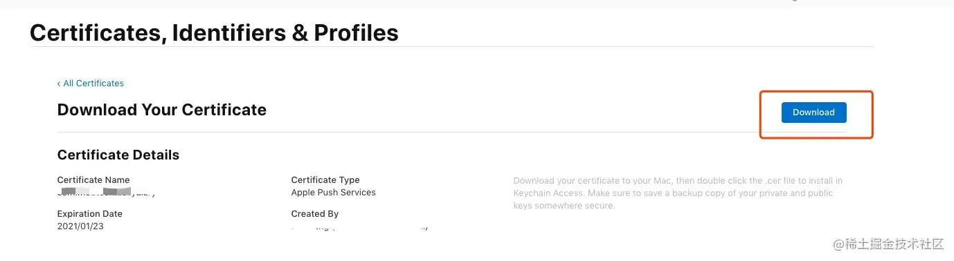 这时会跳转到下载生成证书的页面,点击 “Download” 按钮下载,证书是 .cer 后缀的文件。