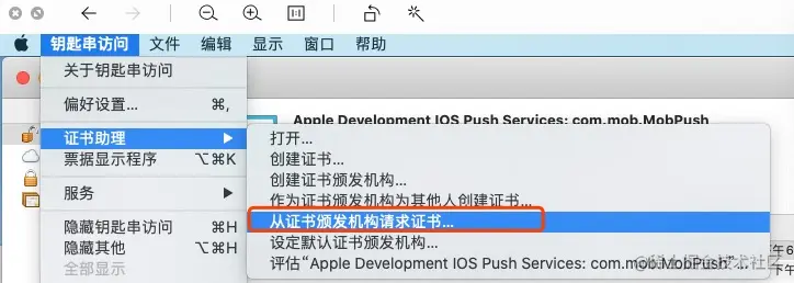 打开系统自带的 KeychainAccess 创建 Certificate Signing Request。如下图操作: