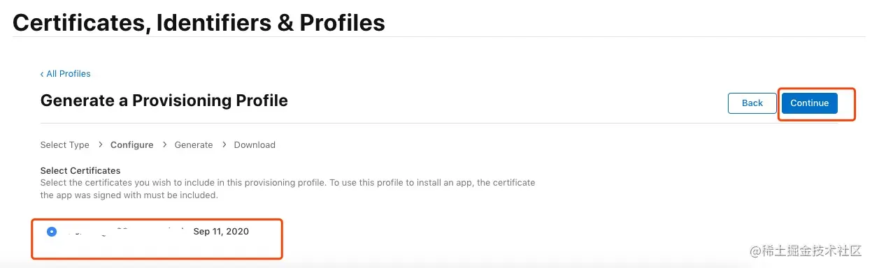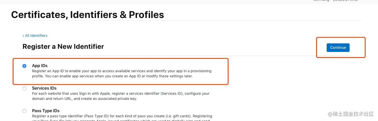 选择所属的开发者证书,再点击“Continue”进入下一步: