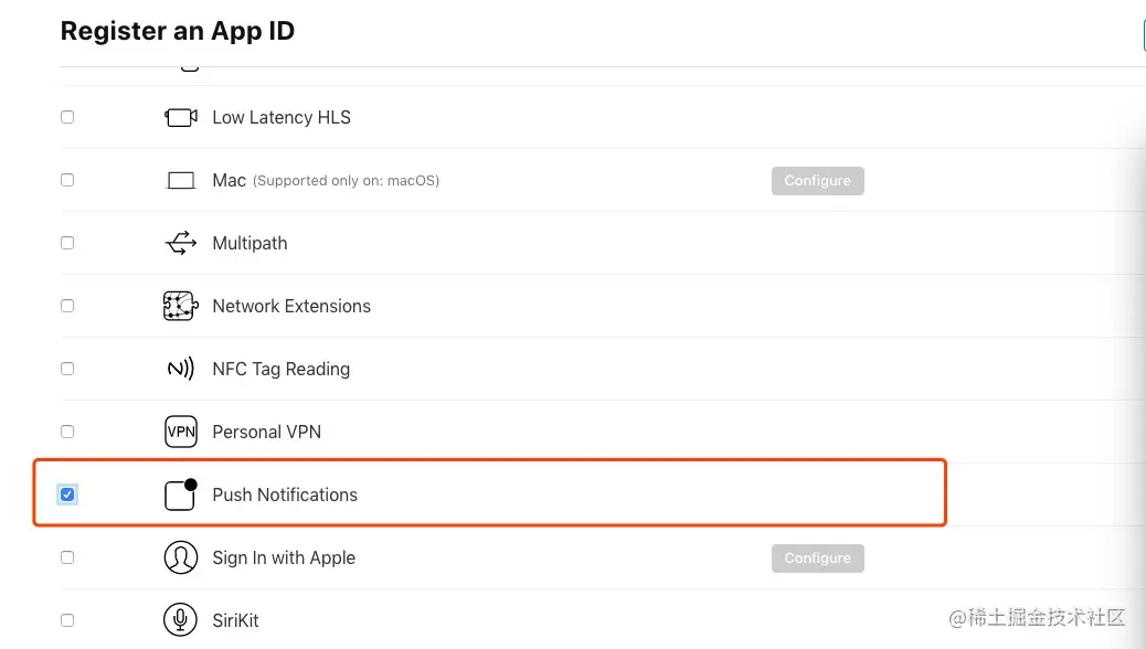 为 App 开启 Push Notification 功能。如果是已经创建的 App ID 也可以通过设置开启 Push Notification 功能。