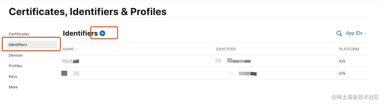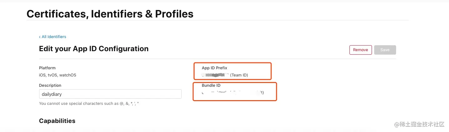 获取你之前创建过的应用的TeamID和Bundle ID,选择identifiers,点击自己创建的identifiers,