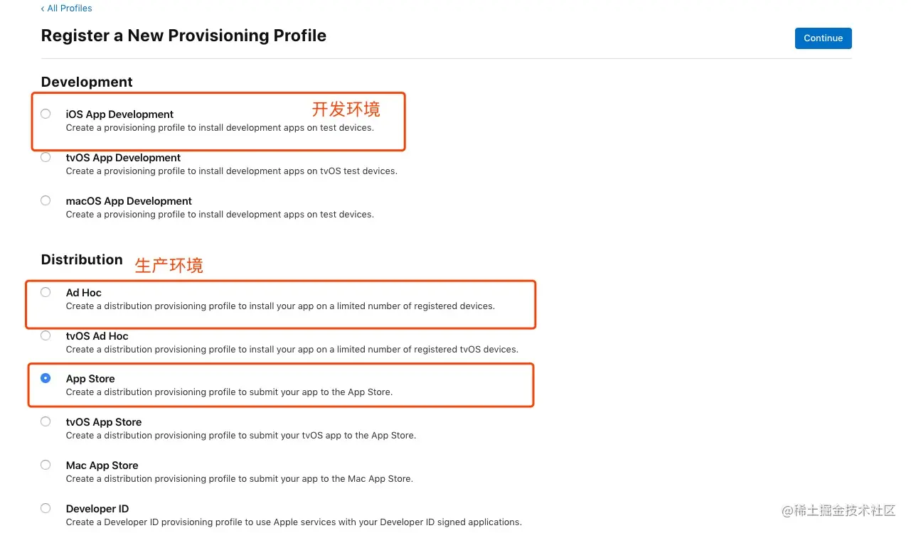 选择此Provisioning Profile的环境后点击“Continue”: