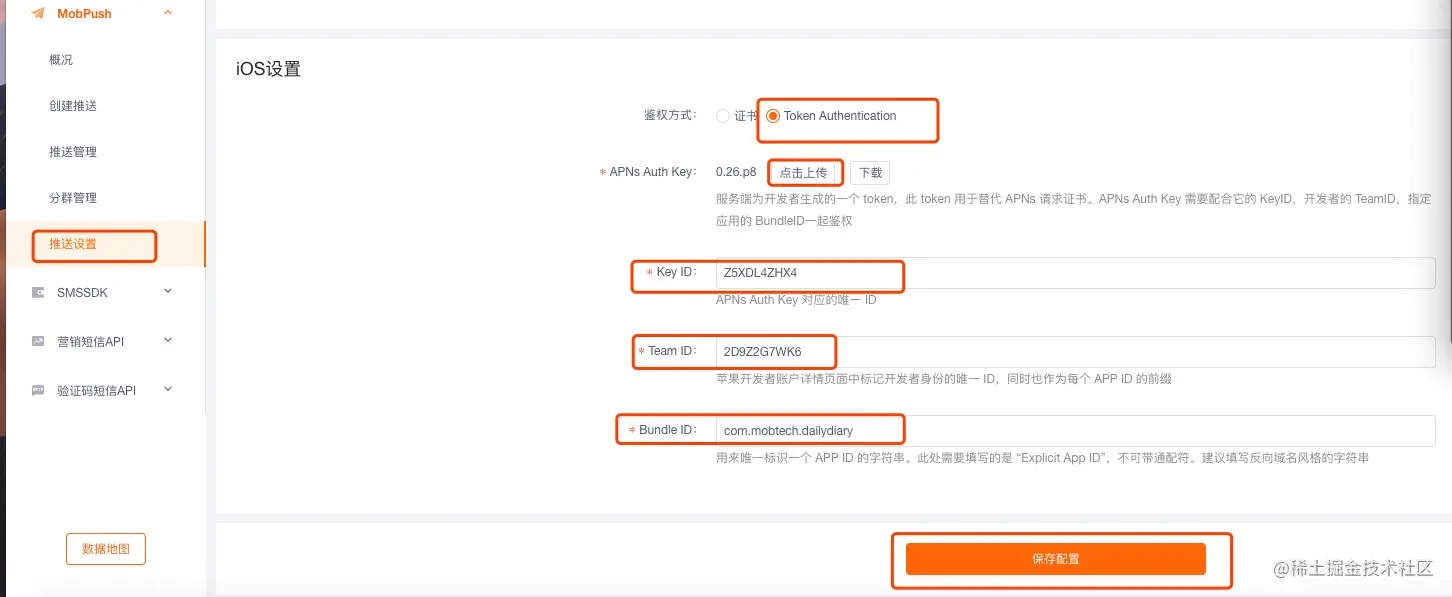 在MobPush的后台上,进入你应用的推送设置中 iOS 的鉴权方式选择 “Token Authentication”,上传 Auth key 文件(p8后缀),并填写你的 Key ID,Team ID,和应用的 Bundle ID即可。我们会在后台为应用进行鉴权。