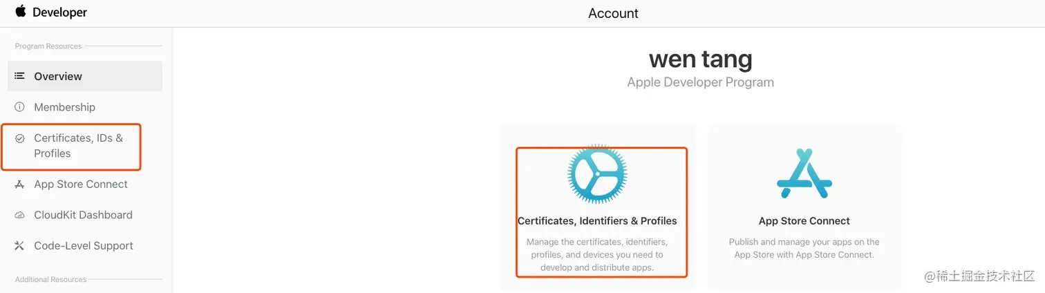 从开发者账户页面进入“Certificates, IDs & Profiles” 页面。
