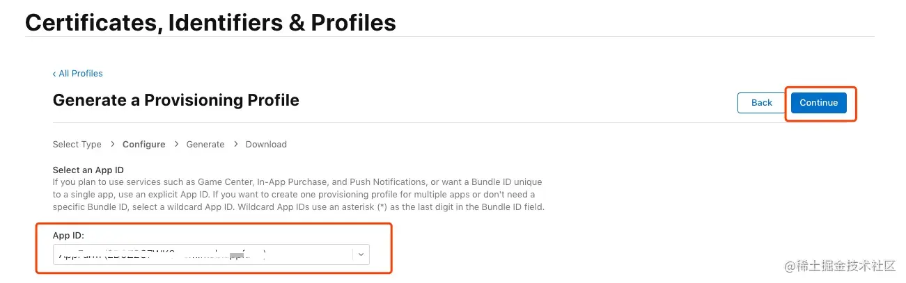 选择要创建Provisioning Profile的App ID后点击“Continue”: