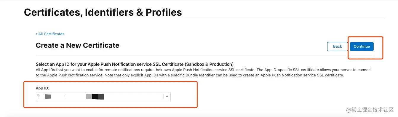 点击 “Continue”, 之后选择该证书准备绑定的 App ID。