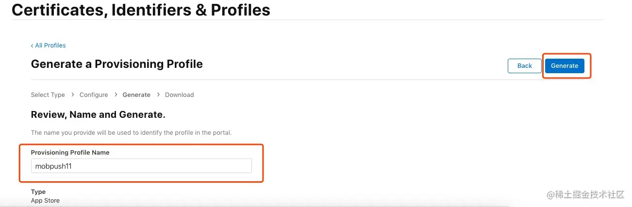 给该Provisioning Profile填写Profile Name,点击“Generate”完成创建。
