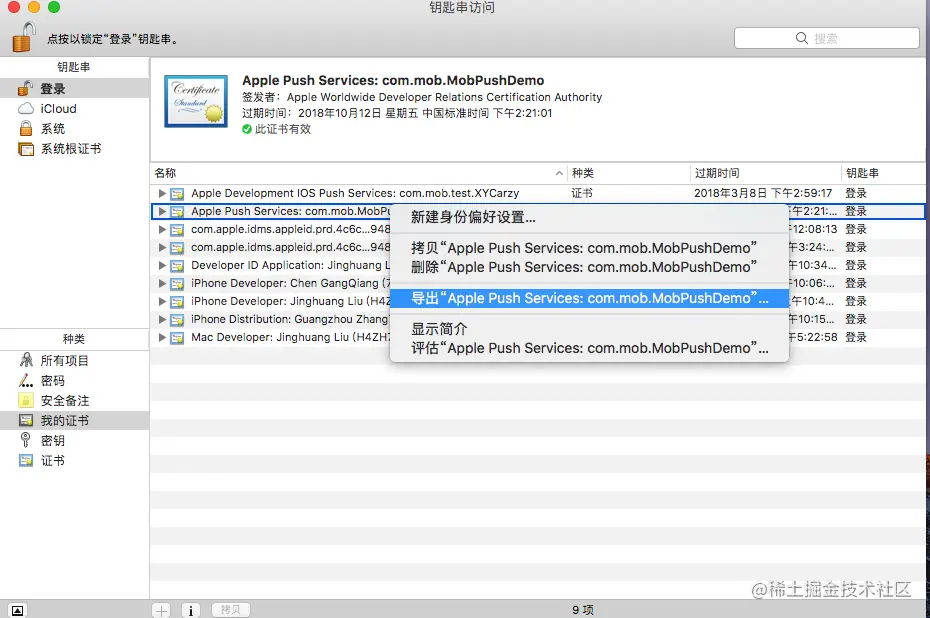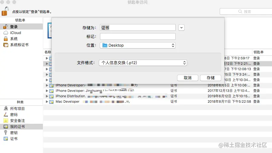 双击证书后,会在“KeychainAccess”中打开,选择左侧“钥匙串”列表中“登录”,以及“种类”列表中“我的证书”,找到刚才下载的证书,并导出为 .p12 文件。如下图: