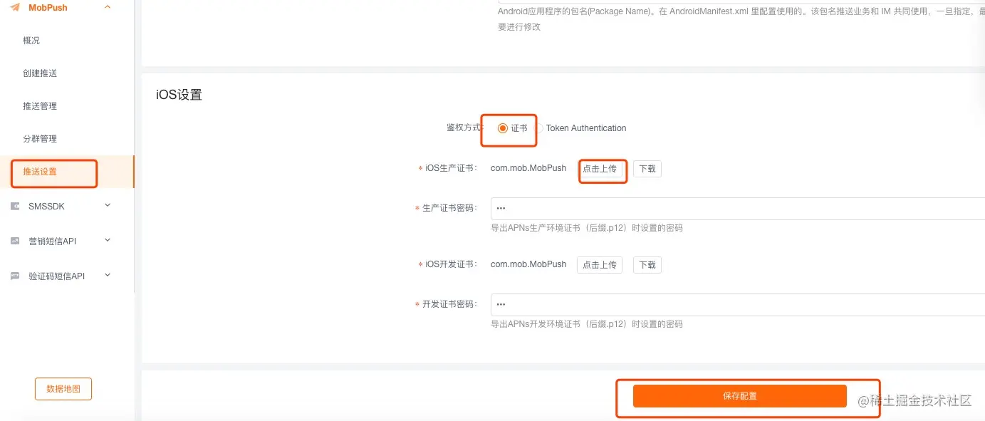 在MobPush的控制台上,进入应用的推送设置中 iOS 的鉴权方式选择 “证书”,上传刚才导出的 .p12 证书即可。