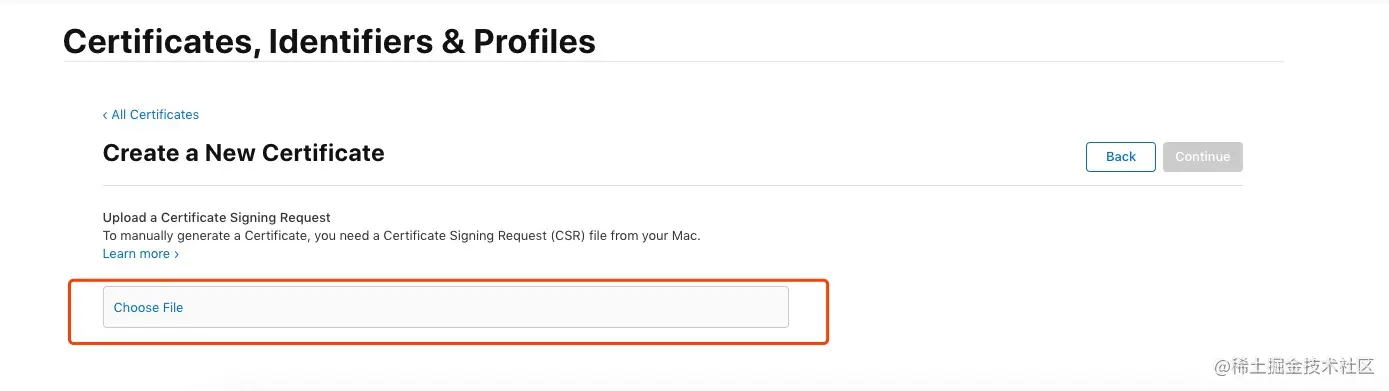 回到浏览器中 CSR 上传页面,上传刚刚生成的后缀为 .certSigningRequest 的文件。点击Continue。