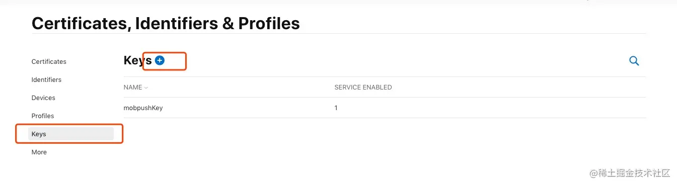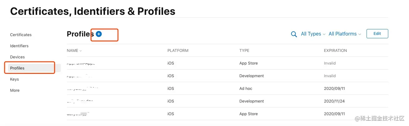 在苹果开发者账号的Provisioning Profile页面点击下图按钮,创建Provisioning Profile。