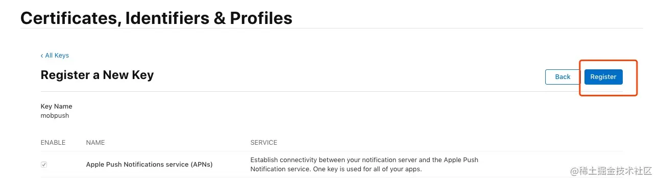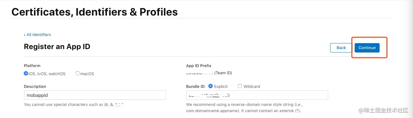 填写好以上属性后,点击 “Continue”,在下一个页面确认 App ID 属性的正确性,点击 “Register”,即完成了 App ID的注册。