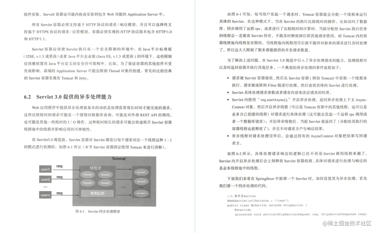 第6章讲解Web Servlet的异步非阻塞处理,包括Servlet 3.0规范是如何提供异步处理能力的,Servlet 3.1规范是如何解决IO阻塞问题的,以及如何在Spring MVC进行异步处理