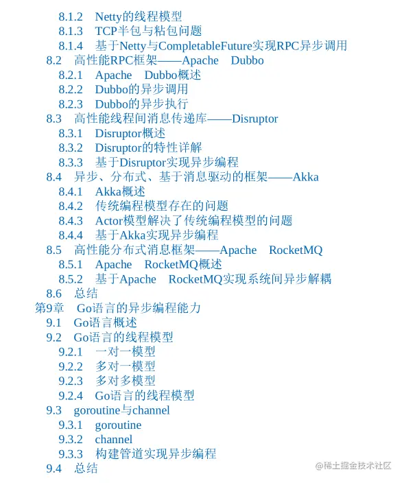 第8章简要介绍了业界为方便实现异步编程而设计的一些框架和中间件,比如异步基于事件驱动的网络编程框架Netty,高性能RPC框架Apache Dubbo,高性能线程间消息传递库Disruptor,异步、分布式、基于事件驱动的编程框架Akka和高性能分布式消息框架ApacheRocketMQ。
