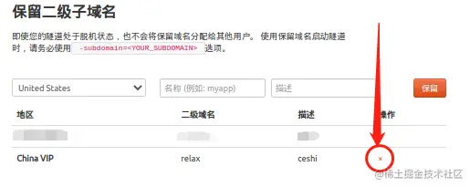 在这个功能下,我们进行几个简单的设置;地区我们选择China VIP;二级域名可以输入方便记忆的内容(如“Relax”);描述可随意输入(只要能自己识别隧道用途即可,这里我们填入“ceshi”)。各项填入完毕后,即可点击右侧的“保存”按钮,将这条数据隧道固定下来。当然,如果觉得某条数据隧道已经不再需要,也可以点击对应行右侧的“红X”将其删除,释放宝贵的数据隧道名额。