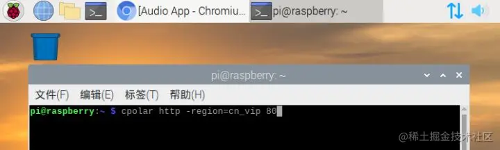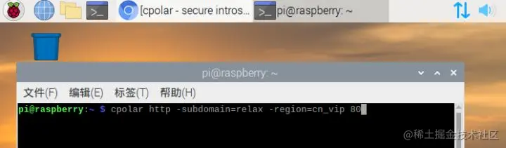 首先在树莓派的命令行界面输入命令,以树莓派本地的80端口生成一条数据隧道。