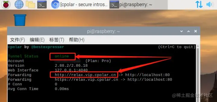 在cpolar云端设置完成后,我们就要转回cpolar客户端,进行保留的数据隧道测试。在本地树莓派的命令行窗口中,输入命令
