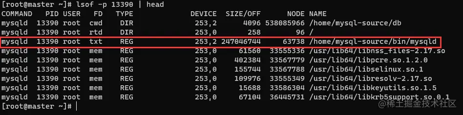 我们先拿到pid值,当然这个命令,已经跟了绝对路径哈,假设没有绝对路径,我们可以使用lsof -p PID值查询,例如: