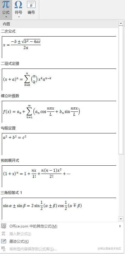如上图所示,Word里提供非常多的公式模板。PS:有没有发现,勾股定理其实也是一种算法。