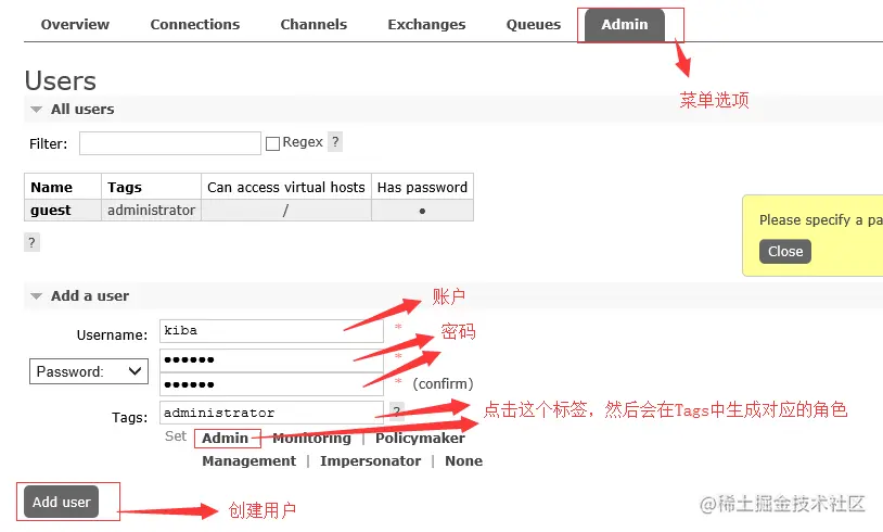 点击菜单栏的Admin选项,进入用户管理界面创建用户kiba,密码123456,如下图:
