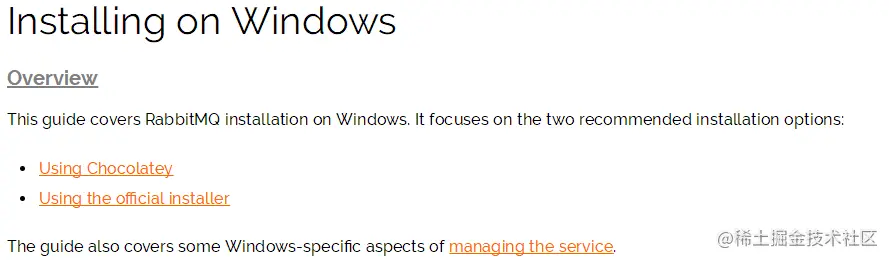 在预览里,我们得知,安装RabbitMQ有两种方法,一种是使用Chocolatey安装,一种是使用官方安装包安装。