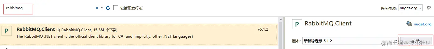 在C#里使用RabbitMQ开源类库非常简单,可以去官网下载一个.NET版本的RabbitMQ客户端类库,也可以直接在Nuget上搜索RabbitMQ,然后安装,如下图: