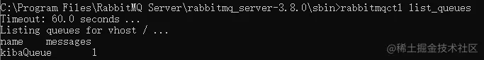 然后我们使用命令行rabbitmqctl list_queues,去RabbitMQ的服务器查看当前消息队列,如下图: