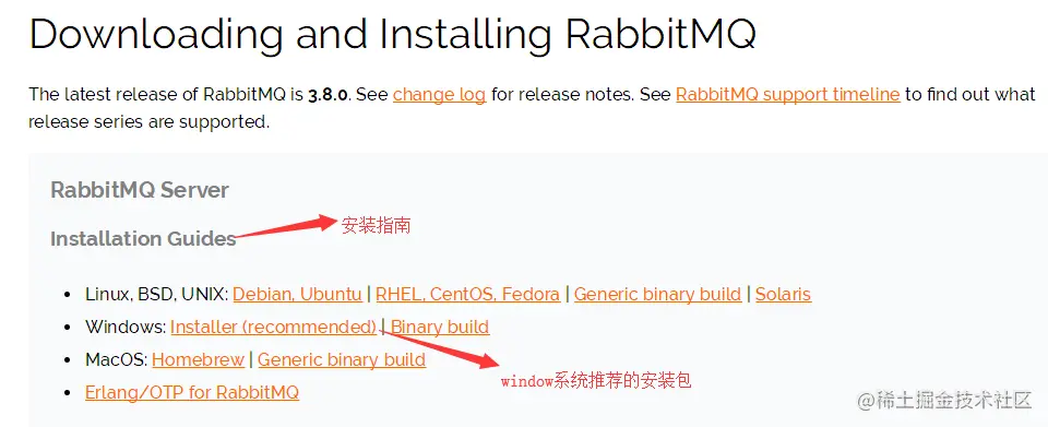 除了下载安装包,我们还会发现,在【Using the official installer】段落里,有提醒我们,RabbitMQ是有依赖的,依赖一个Erlang语言的框架(类似于C#语言的NetFramework)。