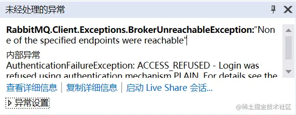 重新运行代码,会发现在运行到factory.CreateConnection()的时候,系统提示一个异常【RabbitMQ.Client.Exceptions.BrokerUnreachableException:“None of the specified endpoints were reachable”】,如下图:
