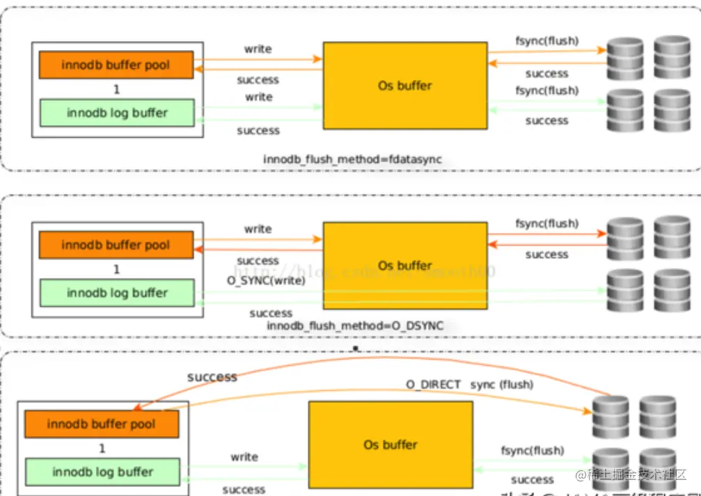 O_DIRECT模式:数据文件的写入操作是直接从mysql innodb buffer到磁盘的,并不用通过操作系统的缓冲,而真正的完成也是在flush这步,日志还是要经过OS缓冲。