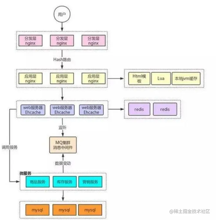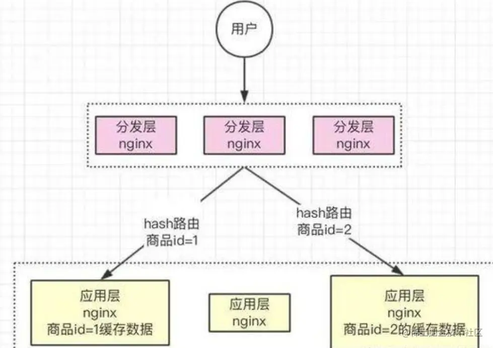 为什么上面还有一层分发层呢?这个是因为大型网站的商品数太多了,应用层nginx的本地缓存是有限的,不可能把所有的商品数据缓存在同一个服务器的本地缓存