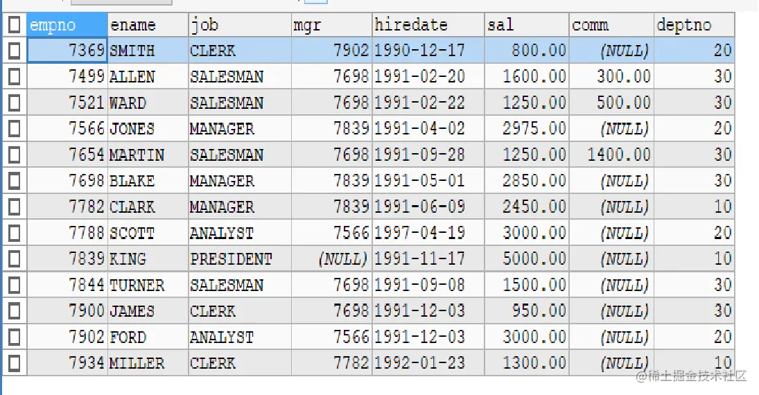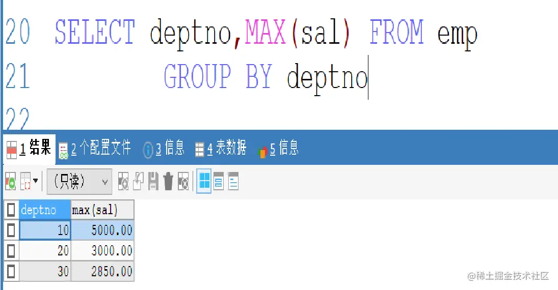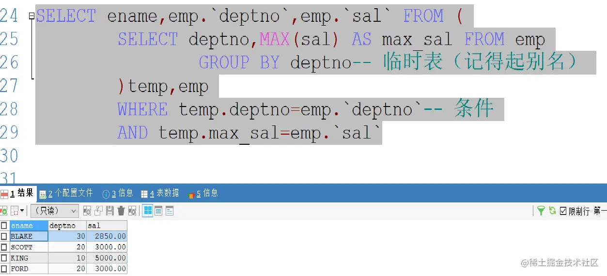 MySQL子查询临时表 ZWF 2022-08-17 406 阅读1分钟 我们在必要时可以将子查询当作一张表使用 例: 我们需要查询各个部门工资最高的员工的信息 我们先找到各个部门工资最高是多少,然后以该子查询为一张临时表,对照原表进行查询 条件是子表的部门号与工资同时和原表的部门号与工资相等