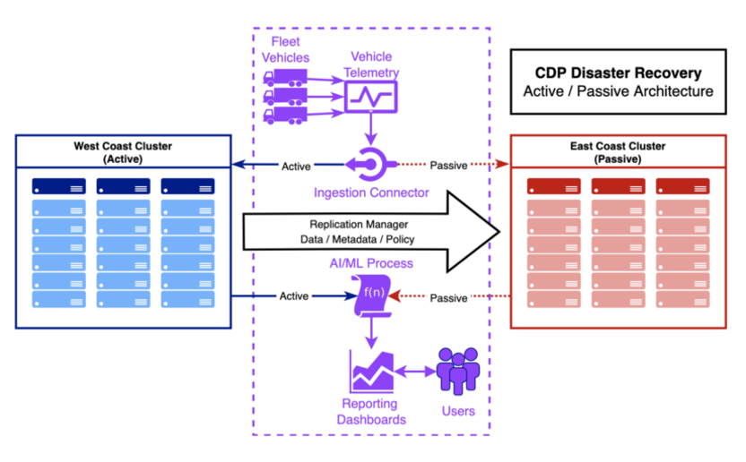 Cloudera 不断改进产品和流程,使灾难恢复更易于实施。在参考架构的未来更新中,我们将描述围绕特定用例的示例实现模式,例如为操作数据库或数据仓库实现地理上分离的集群用例。例如,我们正在为主动/被动、地理上分散的灾难恢复集群对集成架构图,如下图所示,显示了一个公共应用程序区域以及数据摄取和分析,以及复制如何在系统中移动。在此示例中,我们有一个车队遥测用例,它将车辆物联网数据转移到系统中以进行车队维护分析,客户的工程人员不断对其进行审查,以防止意外的机械故障。灾难恢复计划有助于确保在发生意外中断时继续进行维护分析。
