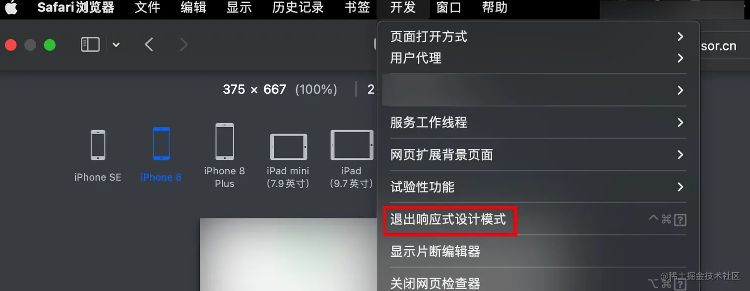 Safari浏览器 function_module 2022-08-17 654 阅读1分钟 safari浏览器模拟iphone浏览器 打开开发者模式 step1:safari > 偏好设置 > 高级,这页最底部有开发菜单勾选项,打勾 step2:浏览器打开调试页面,在标签栏的开发下拉菜单中选择响应式开发即可 📢 注意:safari浏览器只能模拟iphone,不支持安卓