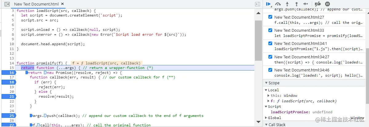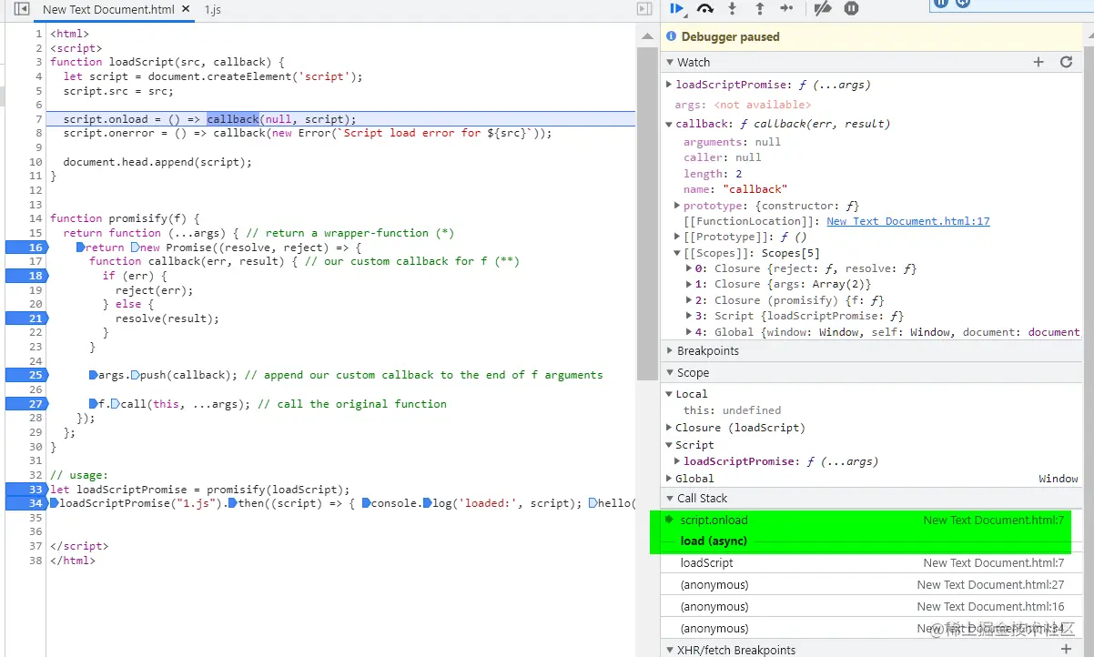 我们期望 script onload 事件发生时,会使用 Promise 自带的 resolve 和 reject 传递参数,因此自己编写了一个 callback 函数,在这个 callback 函数里,使用 Promise 的 resolve 投递结果。