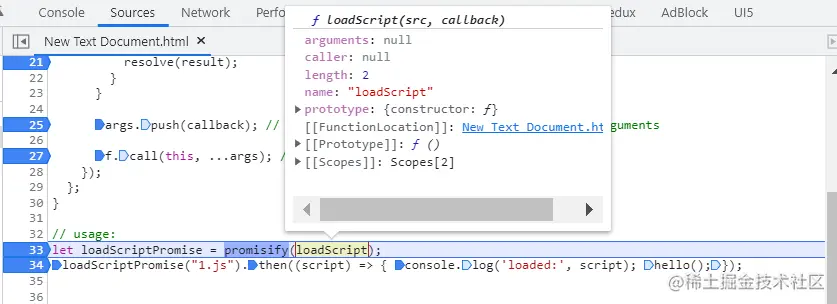 loadScriptPromise("1.js").then((script) => { console.log('loaded:', script); hello();});