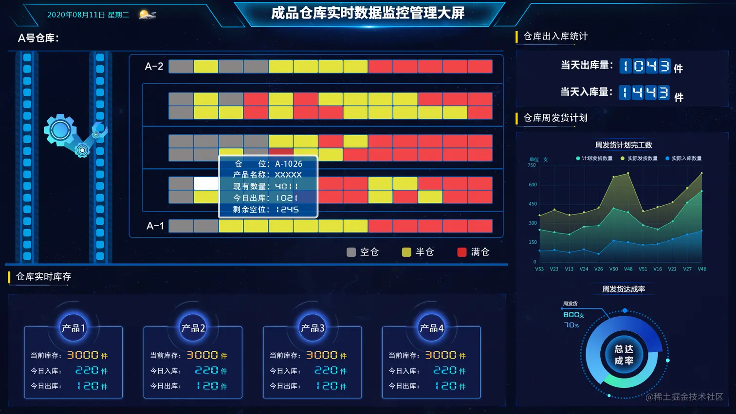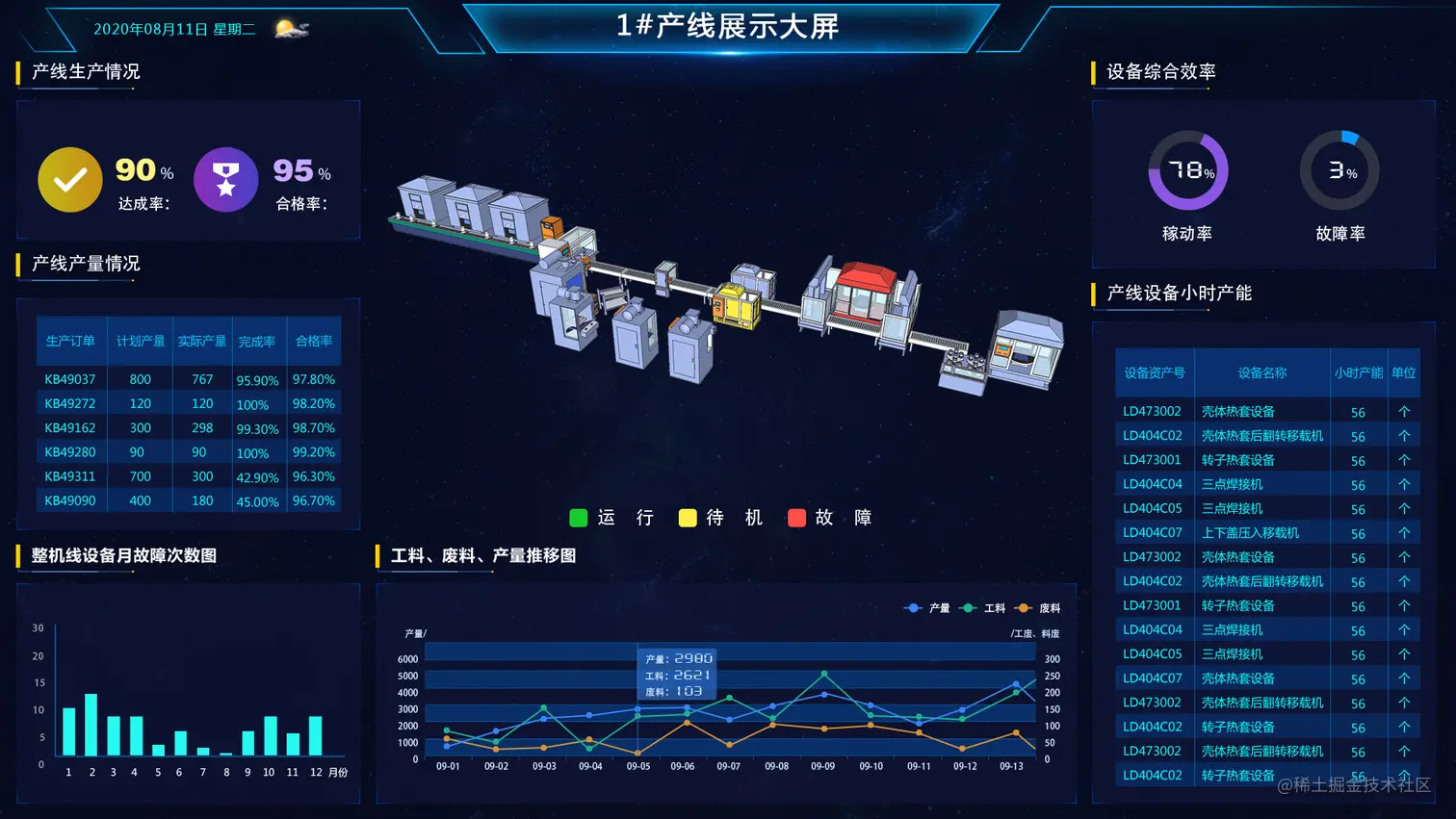 以真实厂房生产线的仿真场景为进出,对各个工段、重要设备、运转流程等管理要素进行真实还原,对产品生产流程、生产进度、生产流程等进行可视化监测,完成厂区工序流转的全方面监控管理。