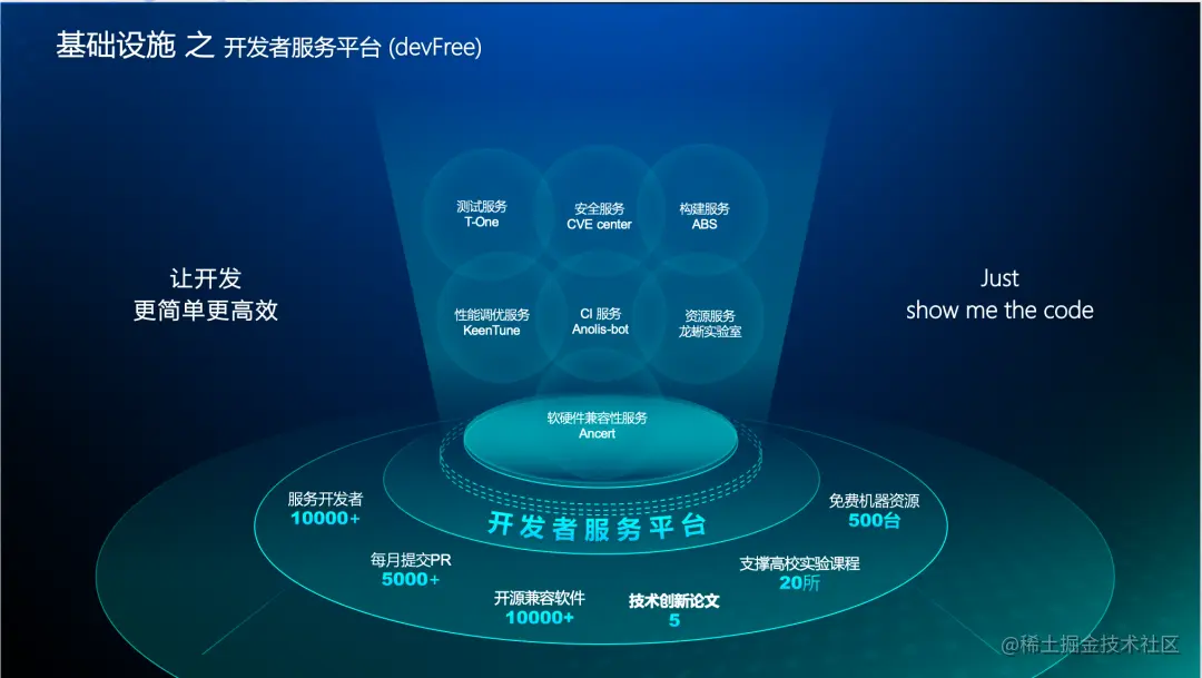 最后是开发者服务平台(devFree),devFree 也是龙蜥社区基础设施不同于其它社区的核心亮点。如果说 anDev 定义了开源产品严格规范的生产流程,那么 devFree 则是提供给社区开发者按需服务模式,给予了充分的、开放的自由发挥空间。我们清楚地知道,开发者对于一个开源社区的重要作用,“得开发者者得天下”,devFree 的愿景是让开发更简单、更高效,因为开发者仅仅需要做的是专注于代码本身,为此龙蜥社区提供了一系列开发者自助服务,如: