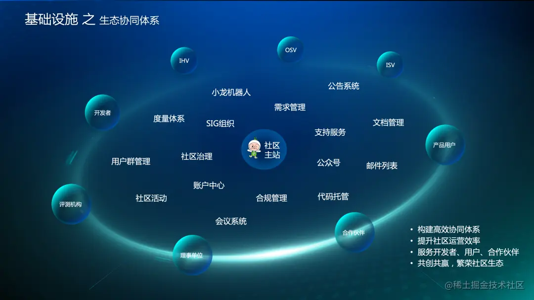 1)生态协同系统提供类似于传统的开源社区基础设施内容(如 CLA 签署、SIG 管理、代码托管、issue 管理系统、官网等等),起到一个社区运行支撑、研发协同的作用。