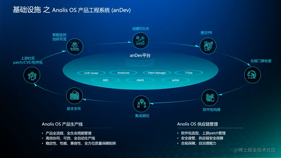 其次是 OS 产品工程(anDev),可以理解为就是龙蜥 OS 产品的生产线。那什么是龙蜥 OS 的生产线呢?其实和芯片的生产线是一样的,我们除了有产品本身的设计能力,生产线系统也是一个产品的核心能力,决定了我们产品是如何被高效、规范、高质量地制造出来,体现了对产品自主可控的程度。这块能力即使对于商业操作系统厂商来说,也是其核心竞争力之一。