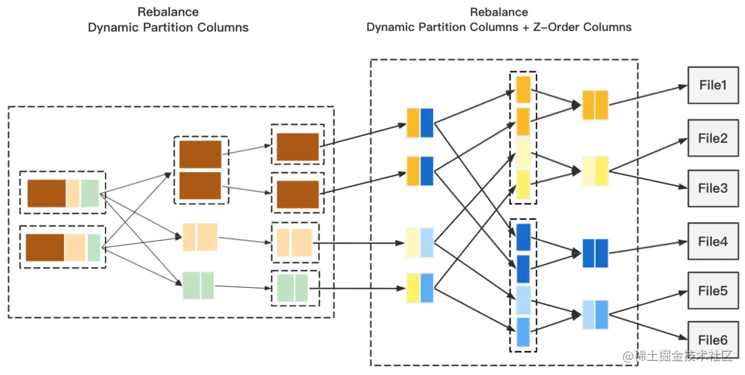 前面我们提到过,动态分区场景下小文件和数据压缩率其实是互斥的,但是显然相比于在业务层面的优化,我们还是有很大的空间在引擎层面同时改善这两个痛点。我们提出了Two-Phase Rebalance + Z-Order,以压缩率优先的前提下尽可能减少小文件。