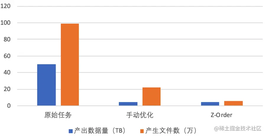 上图展示了一个任务从手动优化切换到 Z-Order 优化的效果,手动优化也是采用前面提到的DISTRIBUTE BY + SORT BY 结合取模的方式,当然手动优化前的任务更加惨不忍睹。Two-Phase Rebalance + Z-Order 优化后,压缩率相比手动优化提升近 13%,相比原始任务提升近 8 倍,文件数相比手动优化下降近 3 倍,相比原始任务下降近 14 倍。与此同时,任务计算性能也有近 15% 的提升。