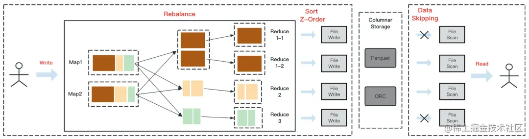 上图展示了Rebalance + Z-Order 运作原理,涉及表的上游任务以及下游任务。首先 Rebalance 以Shuffle 的形式存在,并在 Shuffle 读阶段做分区的拆分和合并,保证每个 Reduce 分区处理相同规模的数据量。基于 Z-Order 的 Data Skipping 优化强依赖于文件格式,我们知道 Parquet 和 ORC 这类主流的列式存储格式会在写数据的同时记录数据的统计信息,比如 Parquet默认会以 Row Group 粒度记录字段的min/max 值,在查询这个文件的过程中,我们会把被 Push Down 的谓语条件和这些统计值做对比,如果不满足条件那么我们可以直接 Skip 这个 Row Group 甚至整个文件,避免拉取无效的数据,这就是 Data Skipping 过程。