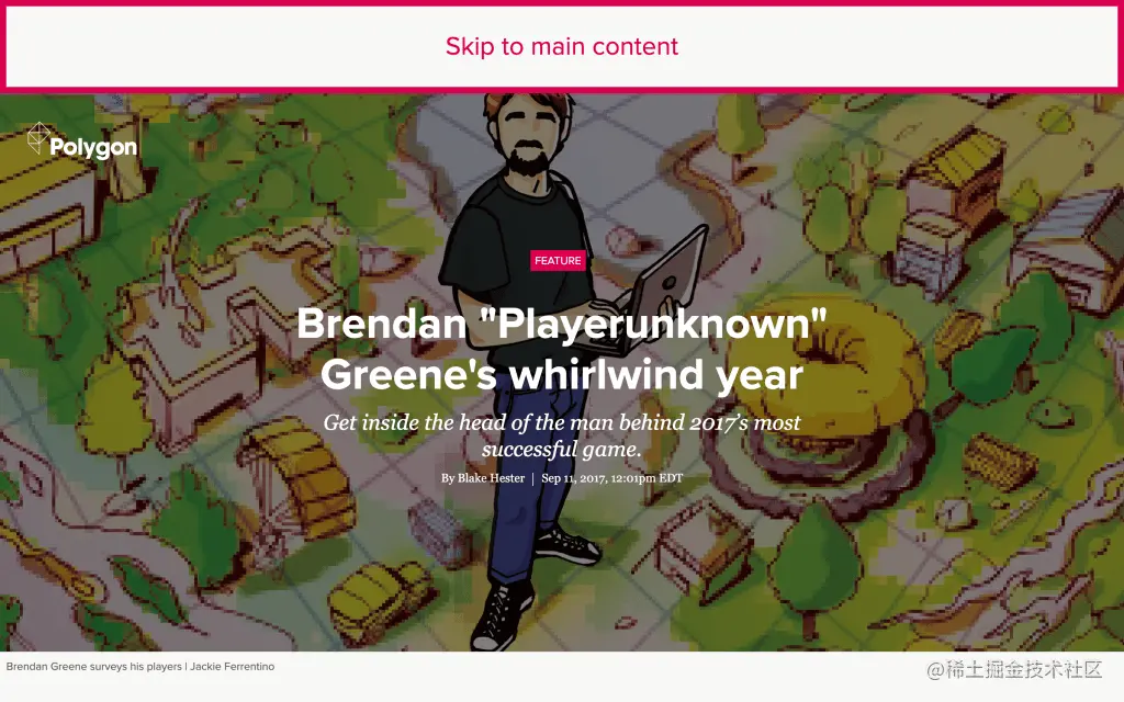 屏幕阅读器允许用户跳到主要内容,只要它包含在一个 <main> 元素中。然而,那些通过标签浏览网站的人并没有从中受益。相反,我们必须创建一个“跳转到主要内容”的锚定链接。这个链接通常是隐藏的,但是一旦用户打开他们的第一个标签(即显示焦点)就会显示出来。