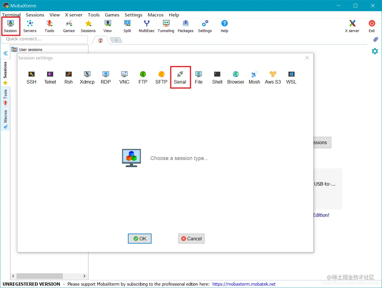 用串口线连接开发板和电脑,然后用MobaXterm软件新建一个serial:
