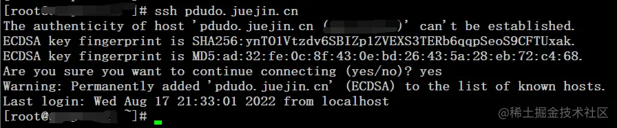 我们来尝试下,我们将id_rsa.pub的内容复制到pdudo.juejin.cn下的/root/.ssh/authorized_keys中。