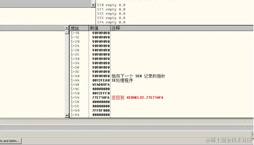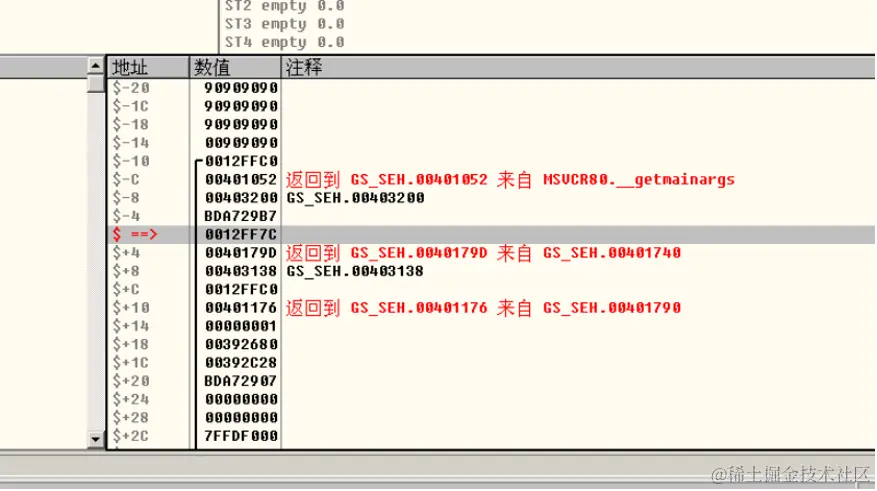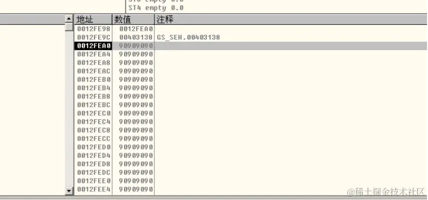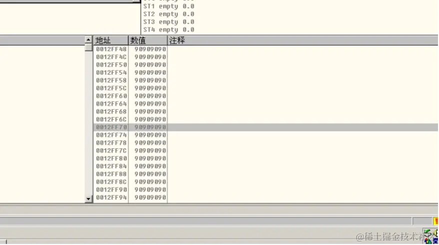 前面一段是我们的弹窗shellcode,之后用90填充其余部位,在最后四字节放入buf的首地址,现在观察堆栈情况: