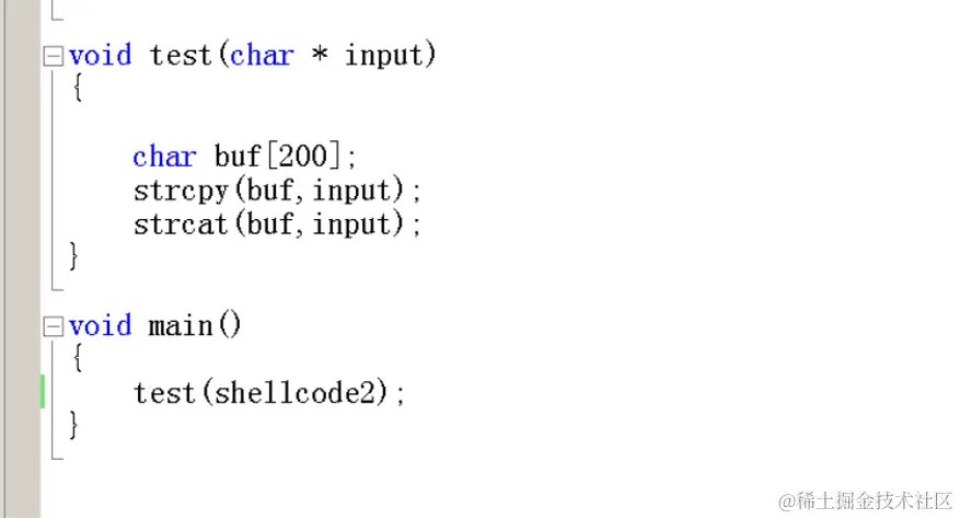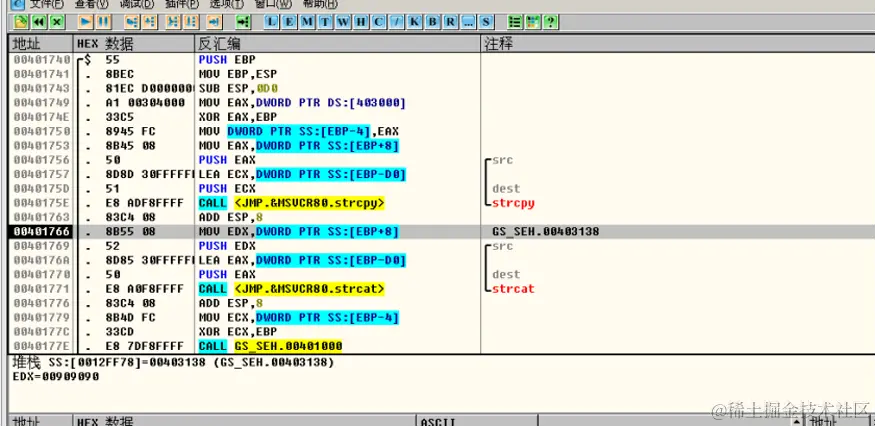 此处就是我们主函数,call是test函数,传入的参数是shellcode2的地址,进入test函数,并运行到strcpy函数之后: